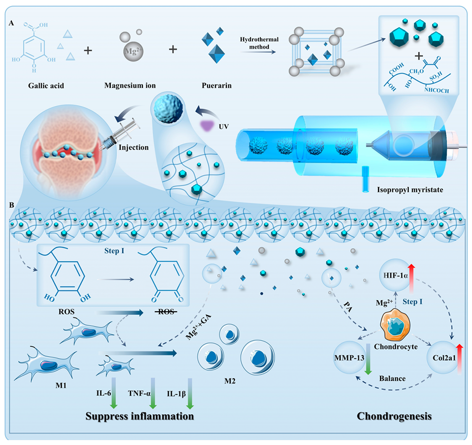 GA是一种富含还原基团的抗氧化剂,能有效清除关节腔内的活性氧(ROS),减轻氧化应激对软骨细胞的伤害,从而改善关节炎症微环境。同时,镁离子(Mg2+)可通过抑制M1型巨噬细胞极化、下调促炎因子的表达(如IL-1β和TNF-α),进一步减轻炎症。