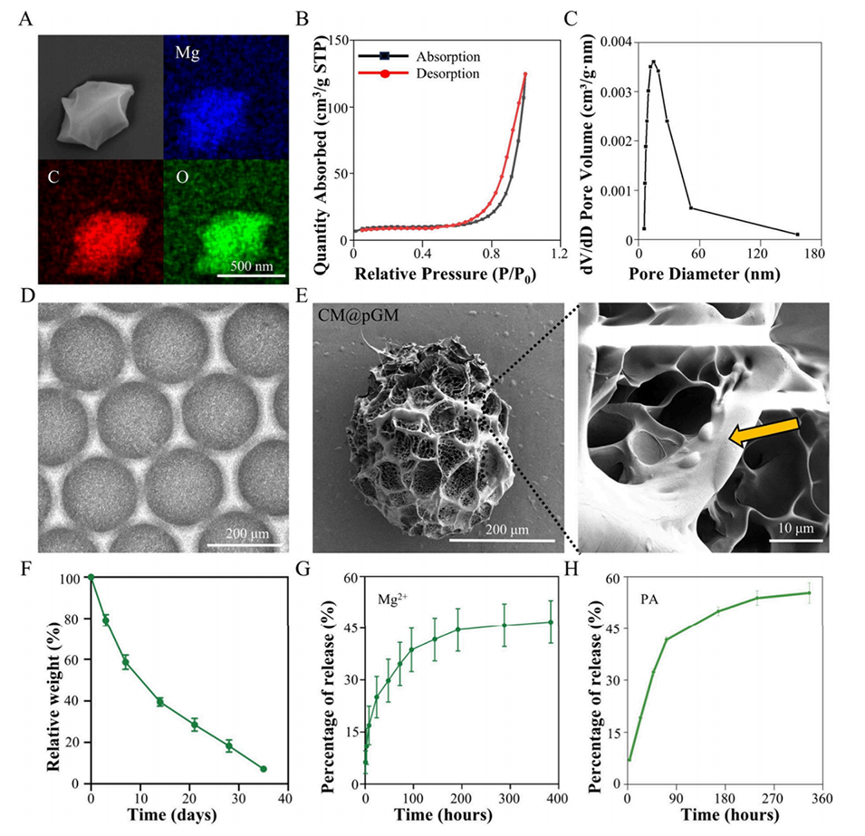 图2.GA-Mg和CM@pGM的特性。(A)GM的扫描电子显微镜(SEM)图像及其元素分析。(B)GM在77K条件下的氮气吸附等温线。(C)GM的孔径分布。(D)CM@pGM的明场显微镜图像。(E)CM@pGM的扫描电子显微镜图像及其元素分析。(F)CM@pGM的降解速率。(G)Mg2+的累积释放曲线。(H)PA的累积释放曲线。样本量n=3。