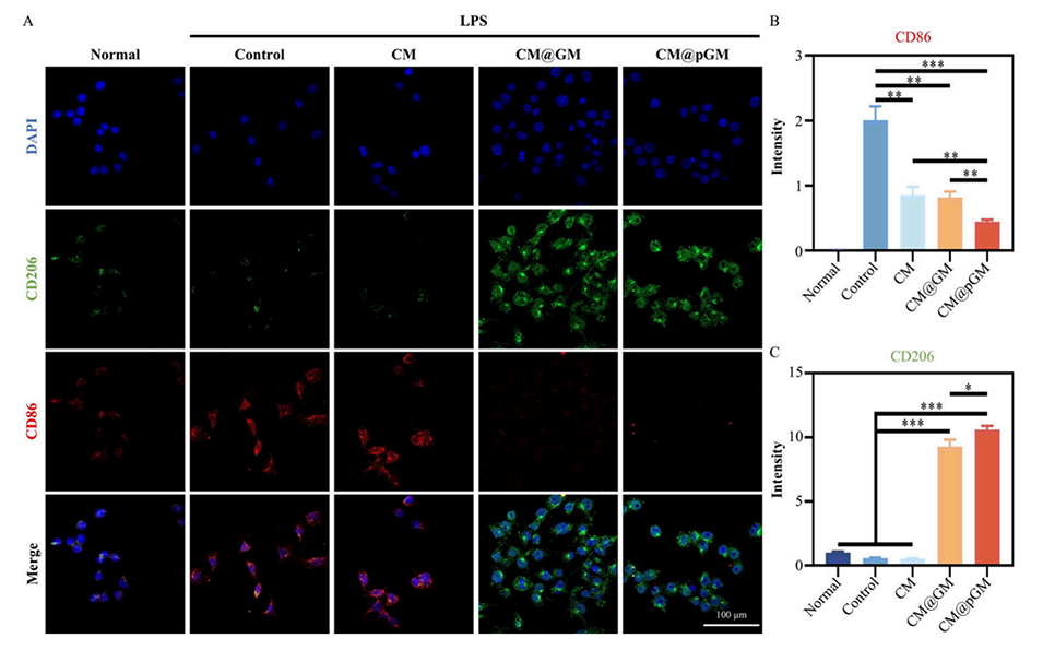 图3.CM@pGM的抗炎特性。(A)经CM@pGM处理后,LPS诱导的巨噬细胞中CD206和CD86表达的共聚焦扫描显微镜(CLSM)图像。(B)CD86的荧光强度定量分析。(C)CD206的荧光强度定量分析。样本量n=3,*p<0.05,**p<0.01,***p<0.001。