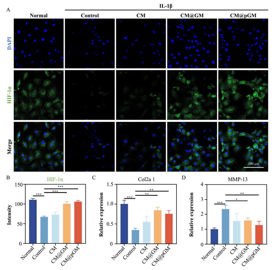 图4.CM@pGM调节软骨代谢平衡。(A)经CM@pGM处理后,IL-1β诱导的软骨细胞中HIF-1α表达的CLSM图像。(B)HIF-1α的荧光强度定量分析。(C)Col2a1水平的RT-PCR检测结果。(D)MMP-13水平的RT-PCR检测结果。样本量n=3,*p<0.05,**p<0.01,***p<0.001。
