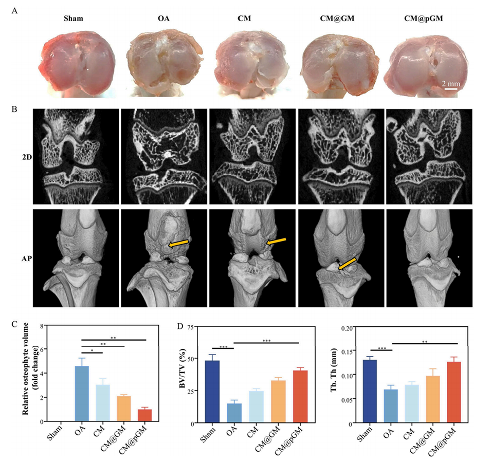 图5.CM@pGM在术后8周对大鼠骨赘负荷及软骨下骨改变的改善。
