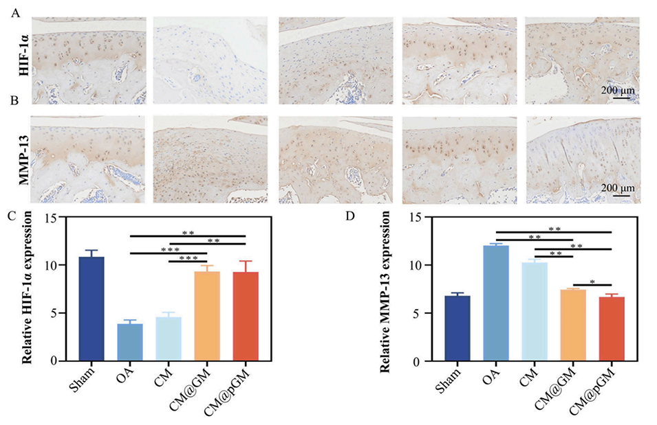 图7.免疫组化染色。(A)HIF-1α蛋白免疫组化染色的代表性软骨图像。(B)MMP-13蛋白免疫组化染色的代表性软骨图像。(C)各组HIF-1α的相对含量。(D)各组MMP-13的相对含量。样本量n=3,*p<0.05,**p<0.01,***p<0.001。