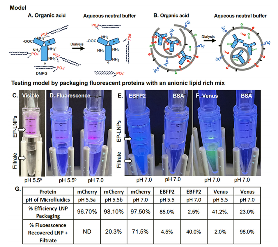 图1.通过微流控方法将蛋白质封装到脂质纳米颗粒中的模型及初步实验结果。