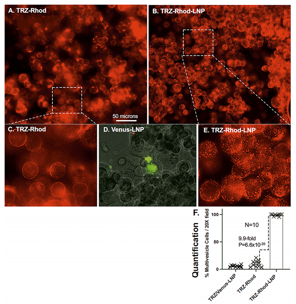 图6.展示了HER2阳性SKBR3细胞在饥饿条件下与TRZ-Rhod和TRZ-Rhod-LNP共孵育后的多囊泡表型。结果显示,TRZ-Rhod-LNP处理的细胞表现出明显的多囊泡表型,而TRZ-Rhod处理的细胞则几乎没有这种表型。