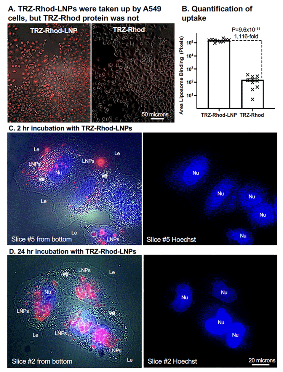 图5.展示了HER2阴性A549细胞与TRZ-Rhod-LNP和游离TRZ-Rhod蛋白共孵育后的荧光显微镜图像。结果显示,TRZ-Rhod-LNP能够被细胞高效摄取并进入细胞质,而游离的TRZ-Rhod蛋白几乎无法进入细胞。