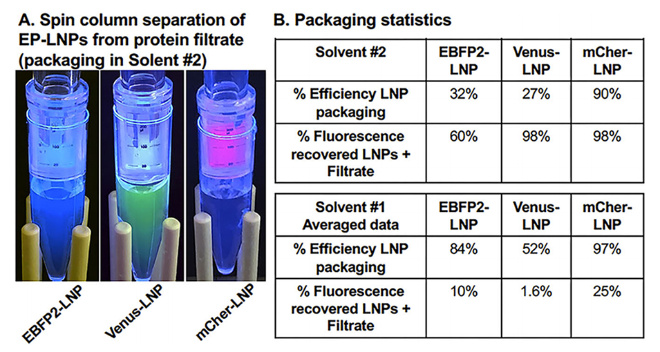 图7.在溶剂#2中制备脂质混合物时,三种荧光蛋白在LNP中的荧光回收率更高。