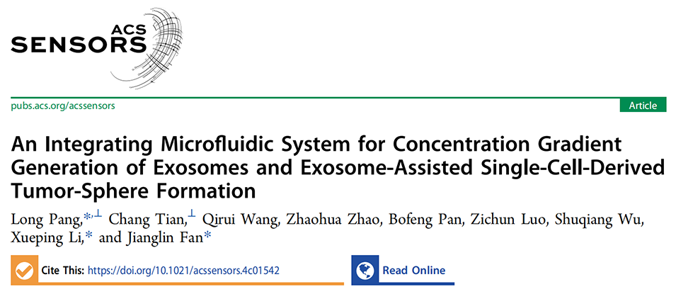 近期,西安医学院庞龙博士、李雪萍教授、范江霖教授等人合作开发了一种集成微流控系统,通过混合HUVEC和NIH/3T3细胞来源的外泌体生成浓度梯度,显著促进了单细胞来源肿瘤球体的形成率和大小,并验证了纳米药物(如PLGA-DOX)相较于传统化疗药物能更有效降低肿瘤干细胞样细胞的耐药性,尤其对小而高变形能力的细胞效果更优。相关研究以“An Integrating Microfluidic System for Concentration Gradient Generation of Exosomes and Exosome-Assisted Single-Cell-Derived Tumor-Sphere Formation”为题目,发表在期刊《ACS Sensors》上。
