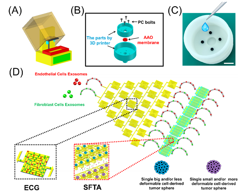 1、本研究开发了一种集成微流控平台,包含外泌体浓度梯度生成器(ECG)和单细胞球体形成陷阱阵列(SFTA),用于评估多种外泌体对STS形成的影响。