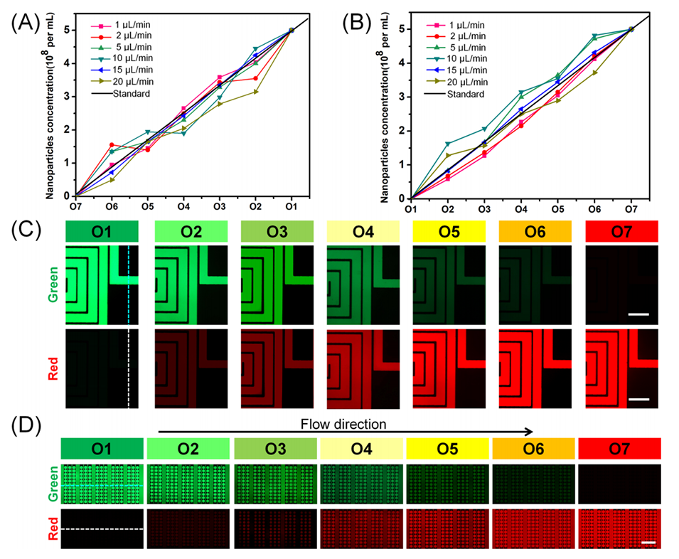 最终,该模块从两个入口注入两种不同来源的外泌体,通过混合和稀释生成7种不同浓度的外泌体梯度,从7个出口释放。