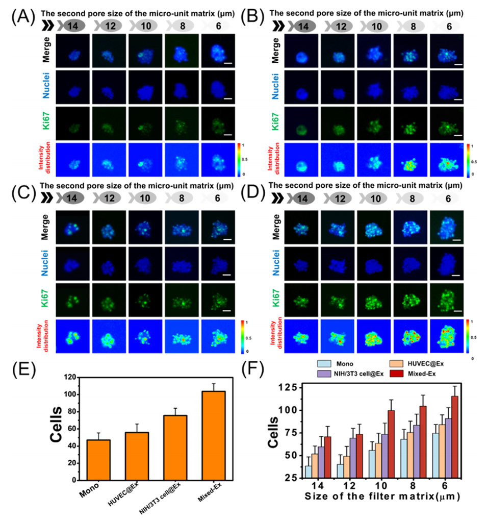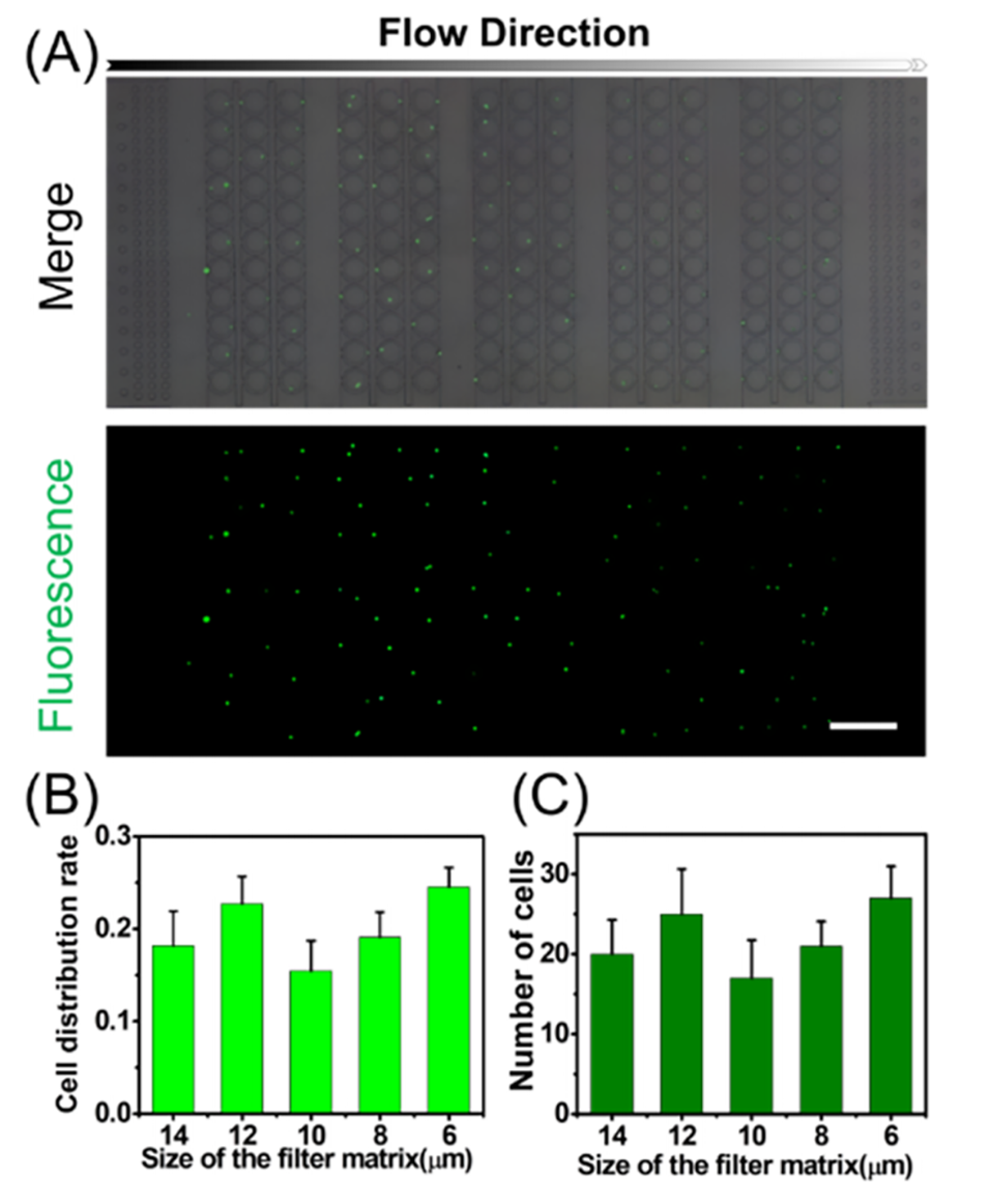 图3.在75 μL/min流速和3000 cells/mL的细胞密度下,MMOF矩阵中单细胞阵列的实验结果。
