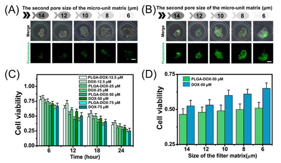 图6.(A,B)经50μM游离DOX或PLGA-DOX NPs处理,然后孵育12小时的STSs的共聚焦荧光显微镜图像(比例尺:50μM)。(C)在不同孵育时间下评估用不同浓度(即12.5、25、50和75μM)的游离DOX和PLGA-DOX NPs处理的STSs的细胞存活率。(D)经50μM游离DOX处理或PLGA-DOX NPs处理,然后孵育12小时,不同微单元矩阵中STSs的细胞存活率。标准偏差来自五个重复实验。