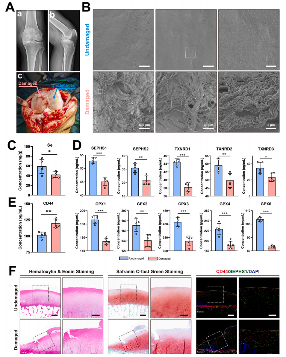 图1.人类骨关节炎软骨实验结果。A)展示了骨关节炎患者的前后位和侧位X光片,以及全膝关节置换术中的受损和未受损软骨的术中照片。B)扫描电子显微镜(SEM)图像显示受损和未受损软骨的表面形态。C)检测受损和未受损软骨中硒(Se)的含量。D)检测受损和未受损软骨中10种与抗氧化相关的硒蛋白水平。E)检测受损和未受损软骨中CD44蛋白的表达。F)对受损和未受损软骨进行组织学分析,包括H&E染色、番红O-固绿染色以及CD44和SEPHS1的双重免疫荧光染色。