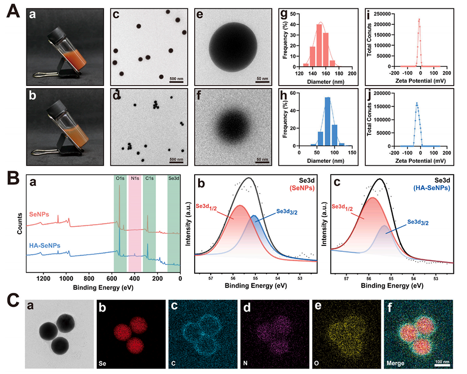 HA-SeNPs通过透明质酸(HA)的修饰设计以提升其稳定性和生物利用度。首先,HA与硒纳米颗粒(SeNPs)表面的羟基形成Se–O键,从而在SeNPs表面构建HA外壳,这显著提高了纳米颗粒的稳定性,避免其快速聚集。研究显示,与未修饰的SeNPs相比,HA-SeNPs在复杂的生物环境如滑液中表现出更高的稳定性,不易沉淀或聚集。