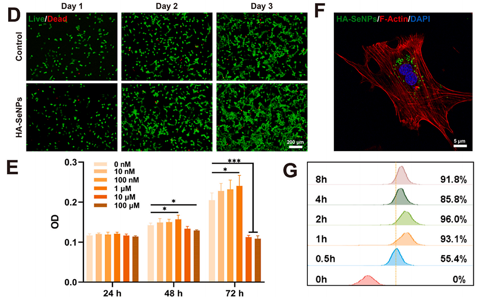 图2.HA-SeNPs的表征。A)展示了SeNPs和HA-SeNPs的外观照片、透射电子显微镜(TEM)图像以及粒径和zeta电位分布。B)通过X射线光电子能谱(XPS)分析SeNPs和HA-SeNPs的表面化学组成。C)利用高分辨率透射电子显微镜(HRTEM)和能量色散X射线光谱(EDS)对HA-SeNPs进行元素分布分析。D)使用活/死细胞染色评估HA-SeNPs的生物相容性。E)通过CCK-8实验评估不同浓度HA-SeNPs对细胞活力和增殖的影响。F)通过激光共聚焦显微镜观察HA-SeNPs在细胞内的摄取情况。G)利用流式细胞仪定量分析细胞对HA-SeNPs的摄取效率。