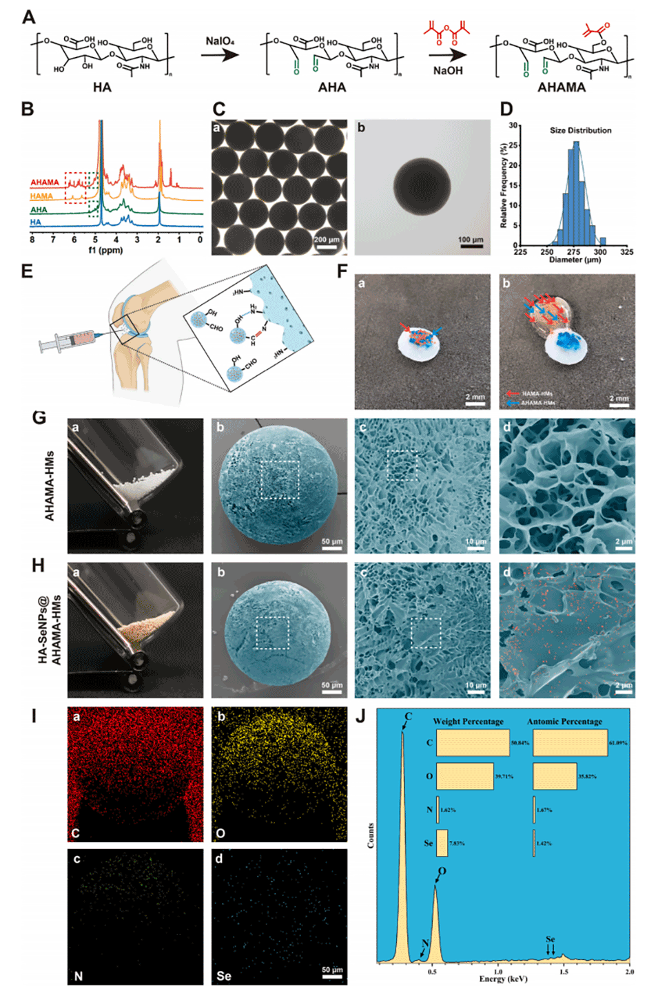 图3.AHAMA、AHAMA-HMs和HA-SeNPs@AHAMA-HMs的表征。A)展示了用HA合成AHA和AHAMA的两步法示意图。B)利用核磁共振(NMR)分析HA、AHA、HAMA和AHAMA的结构。C)通过光学显微镜观察AHAMA-HMs的形态。D)测量AHAMA-HMs的粒径分布。E)展示AHAMA-HMs与受损软骨粘附的机制示意图。F)通过体外实验验证AHAMA-HMs对猪软骨的粘附能力。G)展示AHAMA-HMs的外观照片和扫描电子显微镜(SEM)图像。H)展示HA-SeNPs@AHAMA-HMs的外观照片和SEM图像。I)利用能量色散X射线光谱(EDS)分析HA-SeNPs@AHAMA-HMs中硒元素的分布。J)对EDS元素分布结果进行定量分析。