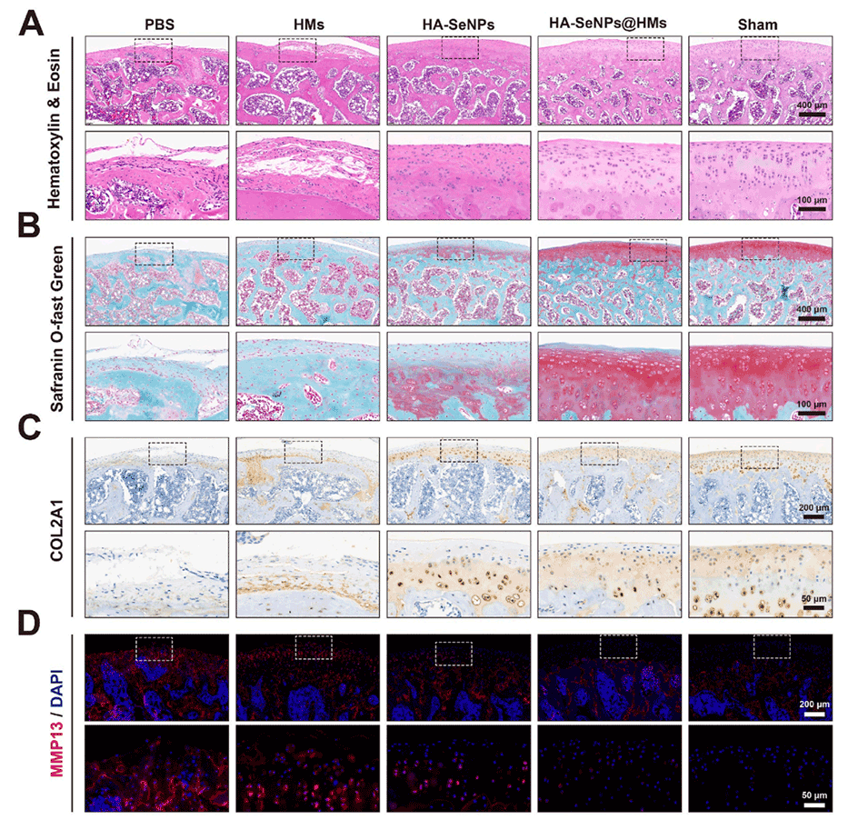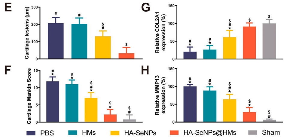 图7.HA-SeNPs@AHAMA-HMs治疗骨关节炎的组织学评估。A)展示了H&E染色结果。B)展示了番红O-固绿染色结果。C)展示了COL2A1蛋白的免疫组化染色结果。D)展示了MMP13蛋白的免疫荧光染色结果。E)对软骨磨损深度进行定量分析。F)对改良Mankin评分进行定量分析。G)对COL2A1免疫组化染色进行定量分析。H)对MMP13免疫荧光染色进行定量分析。