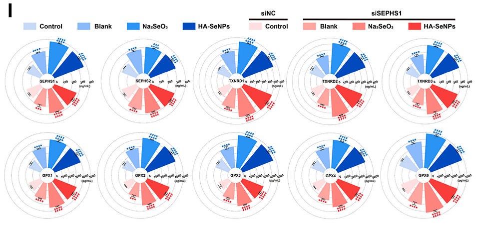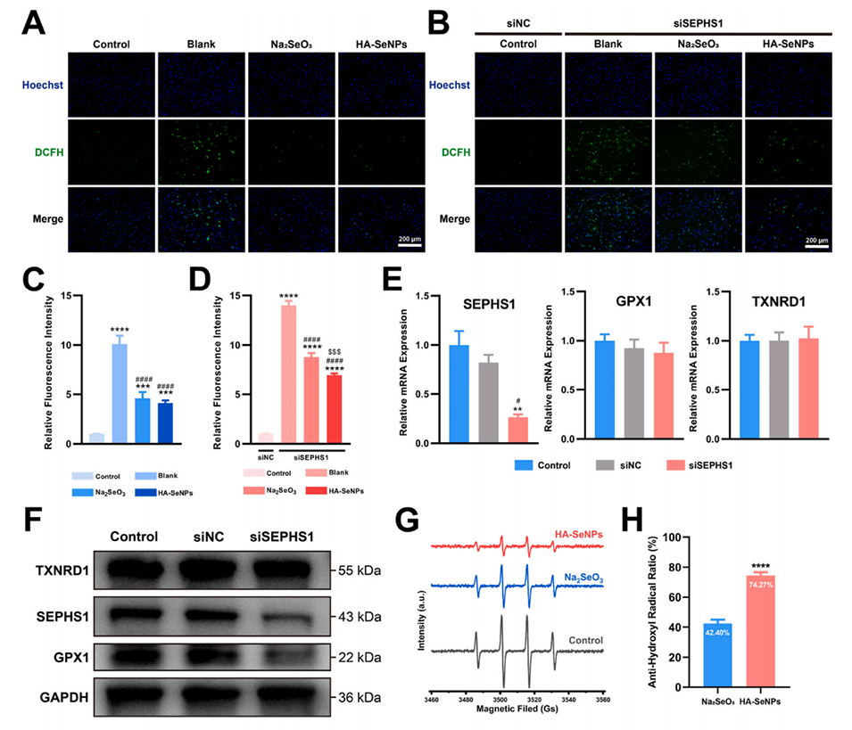 图5.HA-SeNPs的多层面抗氧化防御特性。A-B)利用DCFH-DA法检测siSEPHS1转染前后的细胞内ROS水平。C-D)对DCFH-DA荧光强度进行定量分析。E)利用RT-PCR评估siSEPHS1的敲低效率。F)利用Western blot验证siSEPHS1的敲低效率。G)通过电子顺磁共振(EPR)实验比较Na2SeO3和HA-SeNPs的ROS清除能力。H)对EPR结果进行定量分析。I)检测siSEPHS1转染前后10种与抗氧化相关的硒蛋白水平。