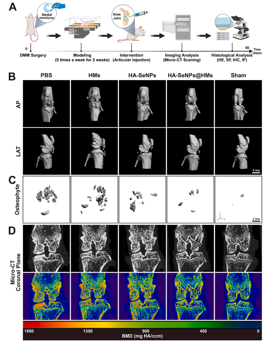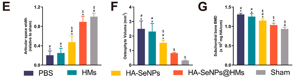 图6.HA-SeNPs@AHAMA-HMs治疗骨关节炎的放射学评估。A)展示了SD大鼠体内实验流程的示意图。B)展示了SD大鼠膝关节的Micro-CT三维重建图像。C)展示了SD大鼠膝关节骨赘的三维重建图像。D)对膝关节骨质疏松进行视觉评估。E)对膝关节间隙宽度进行定量分析。F)对骨赘体积进行定量分析。G)对骨质疏松密度进行定量分析。