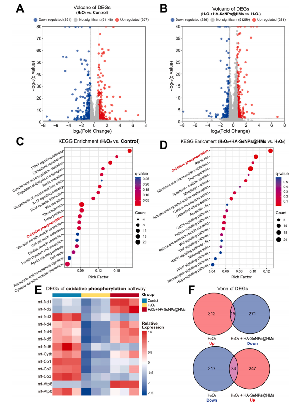 图8.HA-SeNPs@AHAMA-HMs治疗骨关节炎的潜在机制。A)展示了H2O2与对照组比较的差异表达基因(DEGs)火山图。B)展示了H2O2+HA-SeNPs@AHAMA-HMs与H2O2组比较的DEGs火山图。C)展示了H2O2与对照组比较的DEGs的KEGG富集分析结果。D)展示了H2O2+HA-SeNPs@AHAMA-HMs与H2O2组比较的DEGs的KEGG富集分析结果。E)展示了与氧化磷酸化途径相关的DEGs的分析结果。F)展示了H2O2组上调与HA-SeNPs@AHAMA-HMs组下调的DEGs的维恩图,以及H2O2组下调与HA-SeNPs@AHAMA-HMs组上调的DEGs的维恩图。