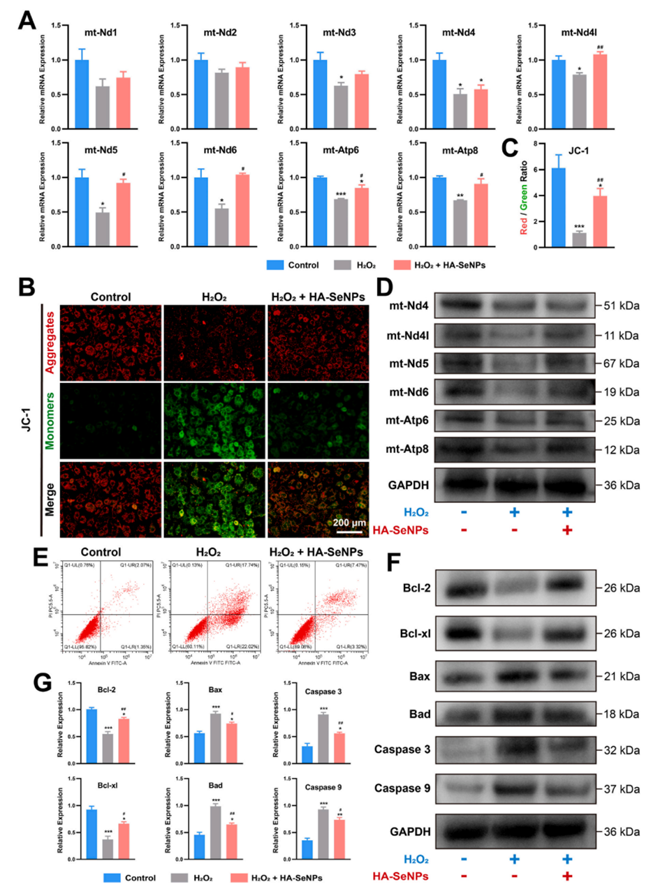 图9.HA-SeNPs@AHAMA-HMs治疗骨关节炎的机制验证。A)检测与线粒体电子传递链复合体I和ATP合酶相关的核心基因的mRNA表达水平。B)利用JC-1染色评估线粒体膜电位。C)通过JC-1染色的红绿荧光强度比值定量评估线粒体膜电位。D)检测与线粒体电子传递链复合体I和ATP合酶相关的核心蛋白的相对表达水平。E)利用流式细胞仪定量分析细胞凋亡水平。F-G)检测凋亡相关蛋白的相对表达水平。