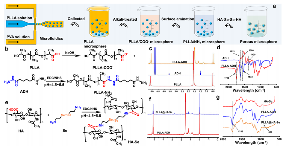 图1.PLLA微球的制备、表面功能化及结构表征。a: 展示了制备和表面功能化PLLA微球的示意图,这些微球对活性氧(ROS)有响应性。b: PLLA-NH2的合成路线。c: PLLA、ADH和PLLA-ADH的1H NMR谱图,显示了PLLA-ADH聚合物的成功制备。d: ADH和PLLA-ADH的FTIR谱图,进一步证实了PLLA-ADH的结构。e: HA-Se的合成路线。f: PLLA@HA-Se和PLLA-ADH的1H NMR谱图,证明了HA-Se成功包裹在PLLA微球表面。g: HA-Se、PLLA-ADH和PLLA-ADH@HA-Se的FTIR谱图,显示了HA-Se的成功制备和表面修饰。