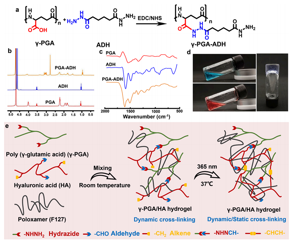 图3.γ-PGA/HA热敏糖肽水凝胶的制备与表征。a: γ-PGA-ADH的合成路线。b: γ-PGA-ADH的1H NMR谱图,显示了ADH成功接枝到γ-PGA上。c: γ-PGA-ADH的FTIR谱图,进一步证实了其结构。d: 展示了γ-PGA/HA水凝胶的制备过程。e: 展示了γ-PGA/HA水凝胶的多重交联机制。