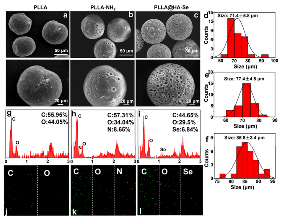 图2.PLLA、PLLA-NH2和PLLA@HA-Se微球的微观形貌表征。a-c: 分别展示了PLLA、PLLA-NH2和PLLA@HA-Se微球的SEM图像,显示了微球的三维球形结构和表面形貌的变化。d-f: 分别展示了PLLA、PLLA-NH2和PLLA@HA-Se微球的粒径分布。g-l: EDS元素分析图,显示了微球表面元素分布的变化,证明了HA-Se的成功修饰。