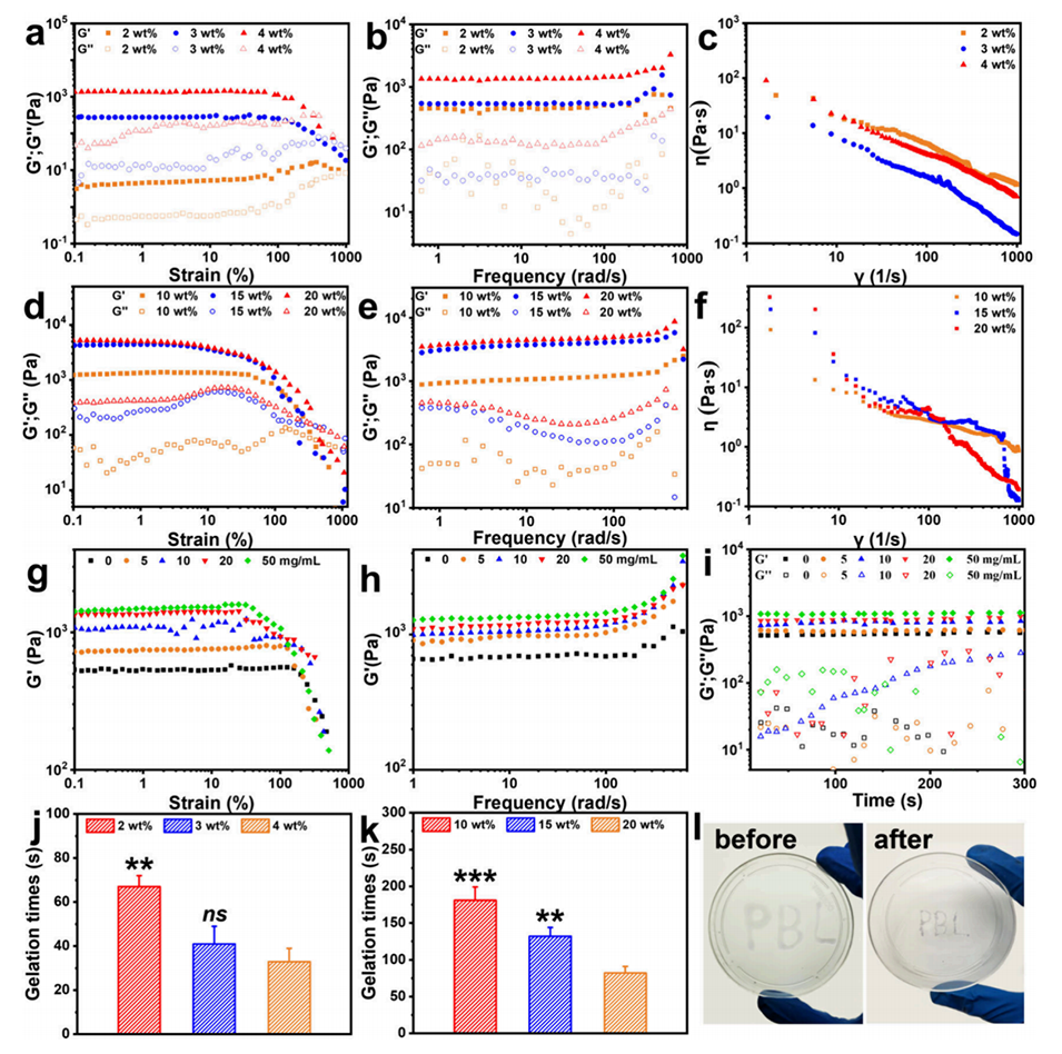 图5.γ-PGA/HA热敏糖肽水凝胶的流变特性和凝胶时间表征。a-c: 分别展示了γ-PGA/HA水凝胶的应力扫描、频率扫描和剪切稀化行为。d-f: 分别展示了γ-PGA/HA/F127水凝胶的应力扫描、频率扫描和剪切稀化行为。g-i: 展示了γ-PGA/HA@PLLA微球复合水凝胶的流变行为,包括应力扫描、频率扫描和时间扫描。j-k: 分别展示了γ-PGA/HA水凝胶和γ-PGA/HA/F127水凝胶的凝胶时间。l: 展示了γ-PGA/HA水凝胶的可注射性测试。