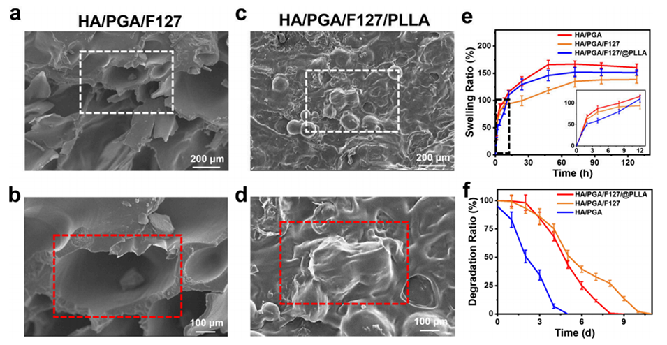 图6.γ-PGA/HA水凝胶的微观形貌与稳定性表征。a-d: SEM图像展示了γ-PGA/HA/F127水凝胶和γ-PGA/HA/F127@PLLA微球复合水凝胶的微观形貌。e: 展示了水凝胶的膨胀能力测试结果。f: 展示了水凝胶的降解行为测试结果。