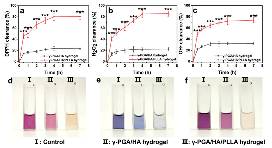 图7.热敏糖肽γ-PGA/HA水凝胶的抗氧化性能评估。a-c: 分别展示了DPPH、H2O2和羟基自由基的清除率,证明了水凝胶/微球复合系统对自由基的清除能力。d-f: 分别展示了DPPH、H2O2和羟基自由基清除的实验图像,进一步证实了水凝胶的抗氧化性能。