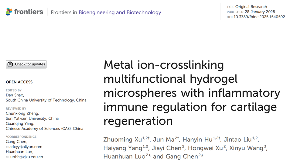 近期,嘉兴市第二医院院长陈刚、中心实验室助理研究员罗欢欢等人利用微流控技术设计了一种多功能聚多巴胺纳米颗粒交联的可注射水凝胶微球,用于骨关节炎软骨修复和免疫炎症微环境调节。相关研究以“Metal ion-crosslinking multifunctional hydrogel microspheres with inflammatory immune regulation for cartilage regeneration”为题目,发表在期刊《Frontiers in Bioengineering and Biotechnology》上。