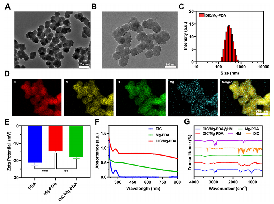 图1.DIC/Mg-PDA的表征。(A)Mg-PDA的TEM图像。(B)DIC/Mg-PDA的TEM图像。(C)DIC/Mg-PDA的粒度分布。(D)DIC/Mg-PDA的EDS图。(E)PDA、Mg-PDA和DIC/Mg-PDA的Zeta电位分析(n=3)。(F)DIC、Mg-PDA、DIC/Mg-PDA的吸光度。(G)HM、DIC、Mg-PDA、DIC/Mg-PDA、DIC/Mg-PDA@HM的FTIR光谱。所有数据均以平均值±标准差表示,采用单因素方差分析和Tukey多重比较检验,ns表示无显著性,*p<0.05,**p<0.01,***p<0.001。