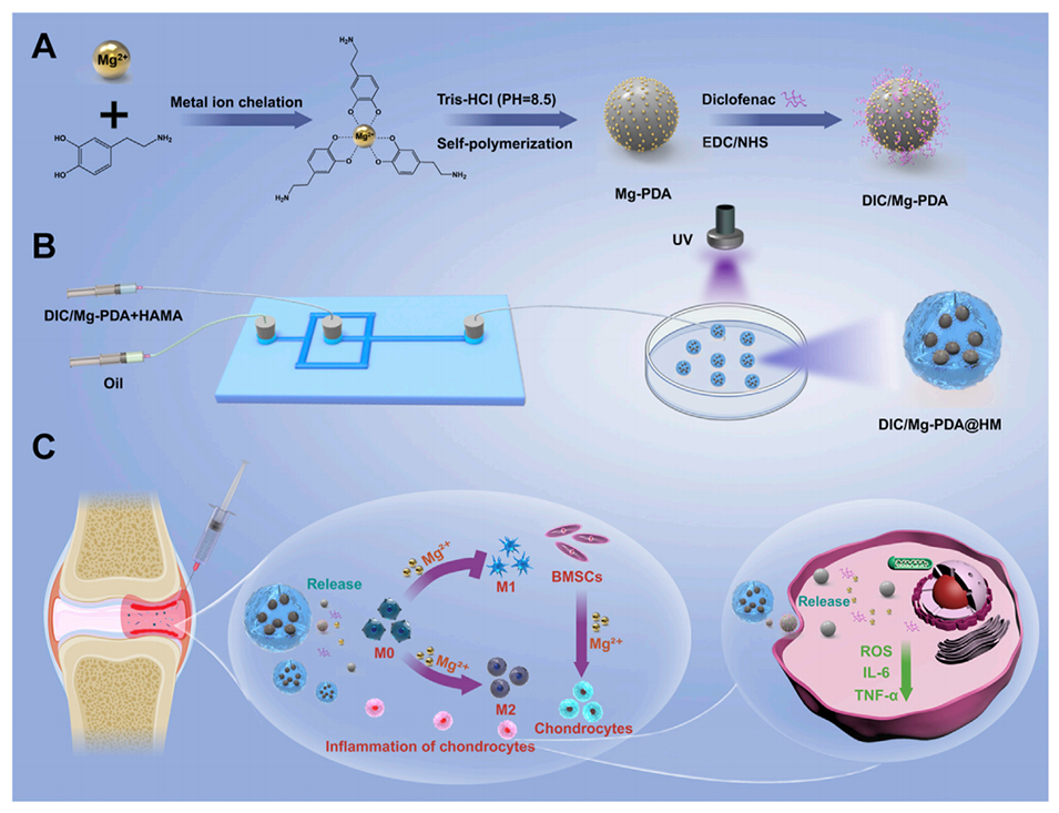 Scheme 1:水凝胶微球的制备及其在骨关节炎治疗中的应用示意图。(A)DIC/Mg-PDA纳米颗粒的制备。(B)DIC/Mg-PDA@HM水凝胶微球的制备。(C)DIC/Mg-PDA@HM的骨关节炎治疗机制。