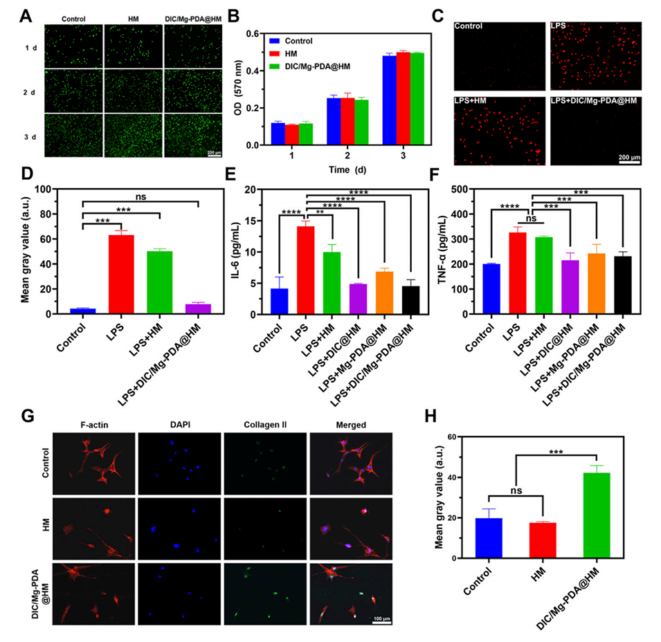 图3.体外细胞实验结果。(A)ATDC5细胞在Control、HM和DIC/Mg-PDA@HM组中的活/死染色结果,显示细胞活性和密度。(B)ATDC5细胞的MTT实验结果,显示细胞增殖情况。(C)DHE染色结果,显示LPS诱导的ATDC5细胞中ROS水平的变化。(D)DHE染色的ImageJ分析结果,显示DIC/Mg-PDA@HM显著降低ROS水平。(E)ELISA检测结果,显示ATDC5细胞分泌的IL-6水平。(F)ELISA检测结果,显示ATDC5细胞分泌的TNF-α水平。(G)BMSCs细胞的免疫荧光染色结果,显示Col-II的表达情况。(H)Col-II表达的荧光强度分析,显示DIC/Mg-PDA@HM显著促进软骨分化。