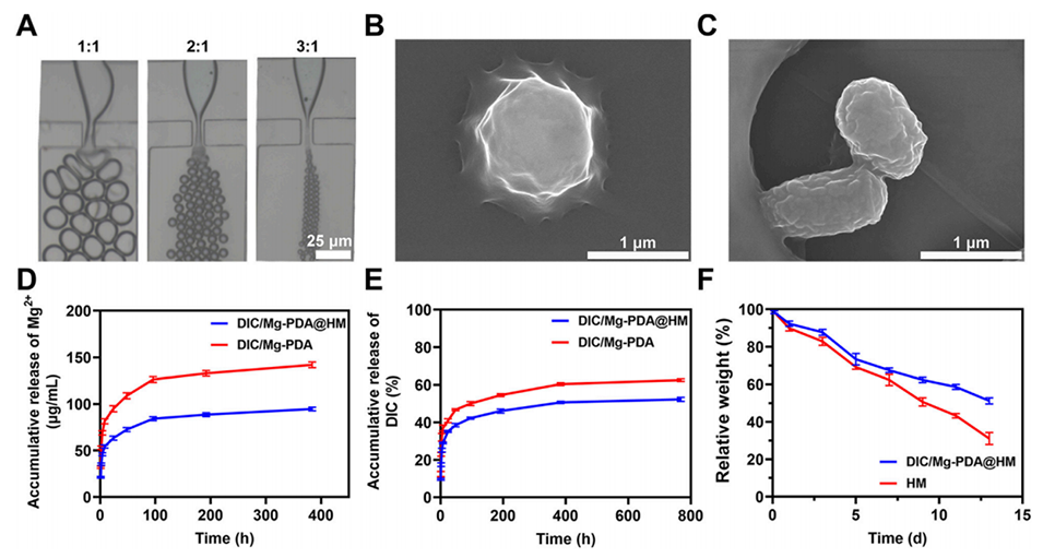 图2.水凝胶微球的表征。(A)在不同水油流速比(1:1、1:2和1:3)下微流控芯片中微凝胶的显微图像。(B)HM的SEM图像。(C)DIC/Mg-PDA@HM的SEM图像。(D)DIC/Mg-PDA和DIC/Mg-PDA@HM在1X PBS溶液中的Mg2+释放行为。(E)DIC/Mg-PDA和DIC/Mg-PDA@HM在1X PBS溶液中的DIC释放行为。(F)HM和DIC/Mg-PDA@HM的降解行为。