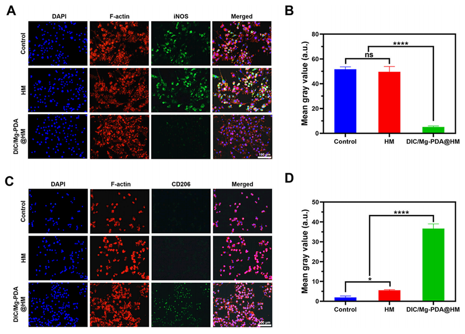 图4.RAW264.7巨噬细胞的表型转化。(A,C)RAW264.7细胞的免疫荧光染色结果,显示M1标志物(iNOS)和M2标志物(CD206)的表达。(B)iNOS荧光强度的ImageJ分析结果,显示DIC/Mg-PDA@HM抑制M1表型。(D)CD206荧光强度的ImageJ分析结果,显示DIC/Mg-PDA@HM促进M2表型。