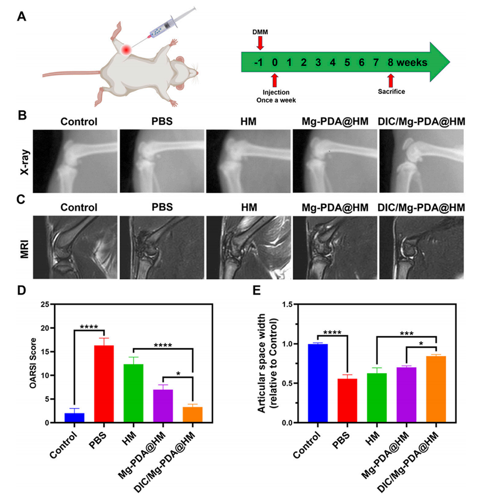 图5.体内治疗效果。(A)OA大鼠模型的治疗方案,显示每周一次的关节腔注射。(B)X射线图像,显示不同组大鼠关节的形态变化。(C)MRI扫描结果,显示不同组大鼠膝关节软骨的信号变化。(D)OARSI评分,用于评估关节软骨病变的程度。(E)关节间隙宽度的相对值,显示DIC/Mg-PDA@HM组的关节间隙狭窄显著减轻。