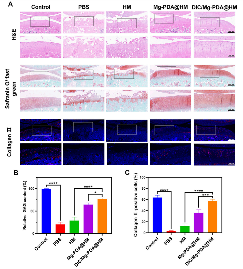 图6.组织学和免疫组化评估。(A)不同组的H&E染色和番红O/固绿染色结果,显示软骨层的完整性。(B)通过ImageJ软件测量的糖胺聚糖(GAG)含量,显示DIC/Mg-PDA@HM组的GAG含量显著增加。(C)通过免疫荧光检测的Col-II表达水平,显示DIC/Mg-PDA@HM组的Col-II表达最高。