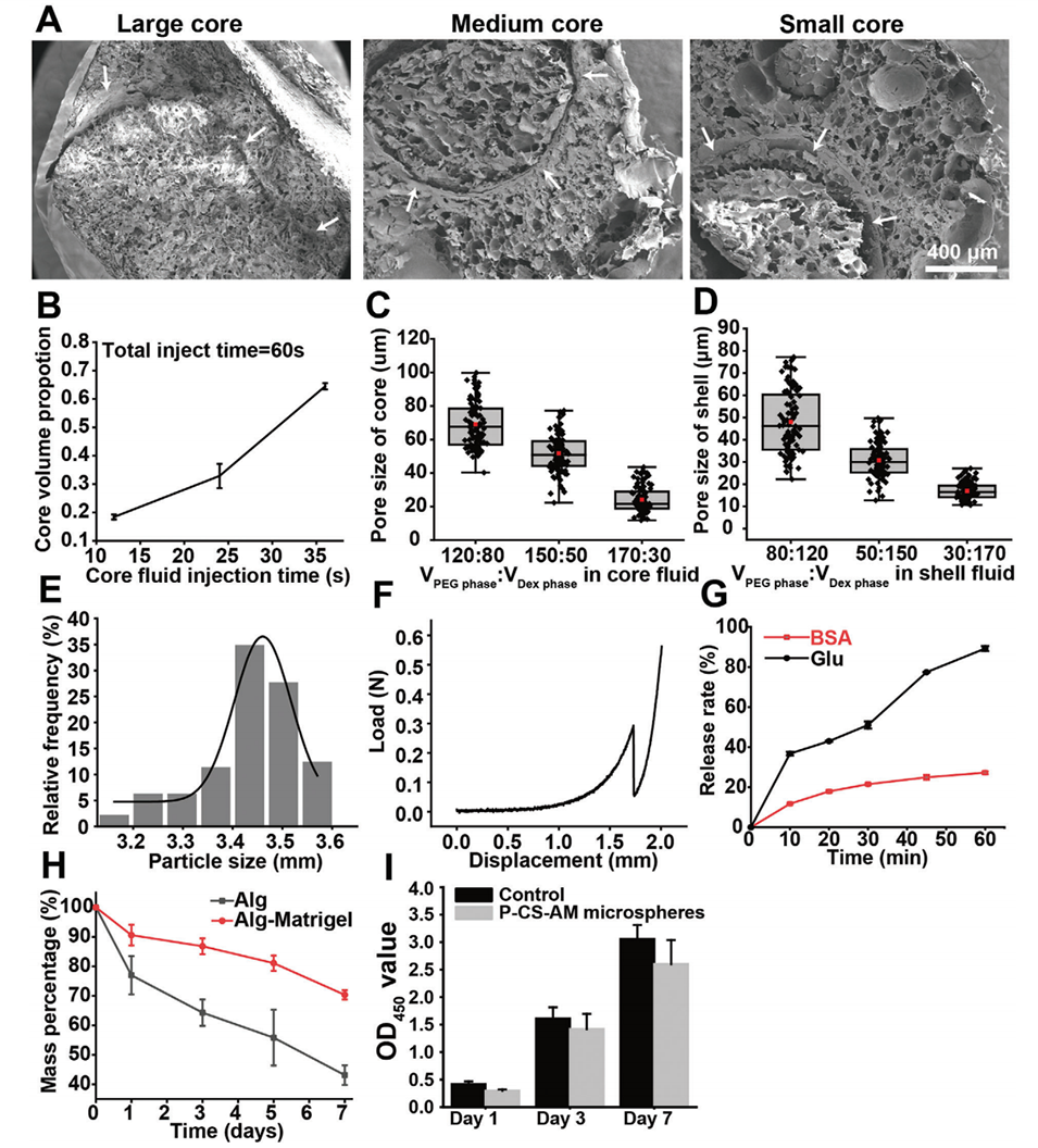 图1:P-CS-AM微球的表征。A:P-CS-AM微球的扫描电子显微镜(SEM)图像,展示了不同核体积比例的微球以及核与壳之间的清晰边界(白色箭头指示)。B:核流体注射时间对微球核体积比例的影响。C:通过调整核流体中PEG相/Dex相的体积比,控制微球核的孔径大小。D:通过调整壳流体中PEG相/Dex相的体积比,控制微球壳的孔径大小。E:P-CS-AM微球的粒径分布。F:P-CS-AM微球的载荷-位移曲线,表明该微球可承受≈0.3N的力而不断裂,其最大承载力可达0.56 N。G:P-CS-AM微球中L-谷氨酸(L-Glu)和牛血清白蛋白(BSA)的释放能力测试。H:P-CS-AM微球与多孔核壳纯海藻酸盐微球的降解性能对比。I:P-CS-AM微球与细胞共培养1、3、7天的生物相容性测试,细胞存活率约为85%。