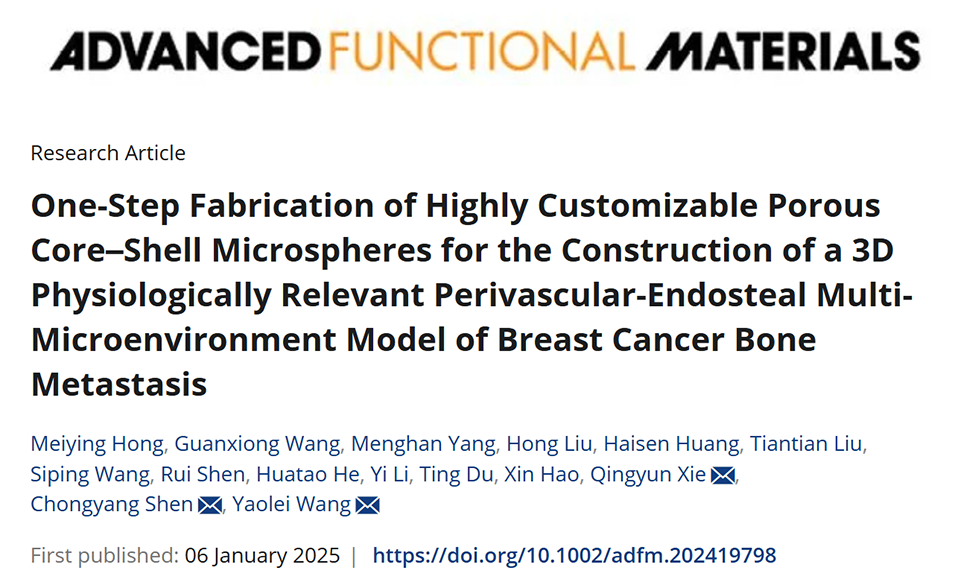 近期,西南交通大学王垚磊副教授、成都中医药大学申重阳副教授、西部战区总医院骨科副主任医师谢庆云等人通过嵌套双水相体系乳液模板技术开发了一种新型多孔核壳微球,成功构建了模拟乳腺癌骨转移的3D血管周围-骨内膜多微环境模型(PVM-EM),实现了对微环境的精确调控,并有效模拟了早期骨转移的关键生物学过程,为临床前研究和药物筛选提供了高效、精准的模型。相关研究以“One‐Step Fabrication of Highly Customizable Porous Core–Shell Microspheres for the Construction of a 3D Physiologically Relevant Perivascular‐Endosteal Multi‐Microenvironment Model of Breast Cancer Bone Metastasis”为题目,发表在期刊《Advanced Functional Materials》上。