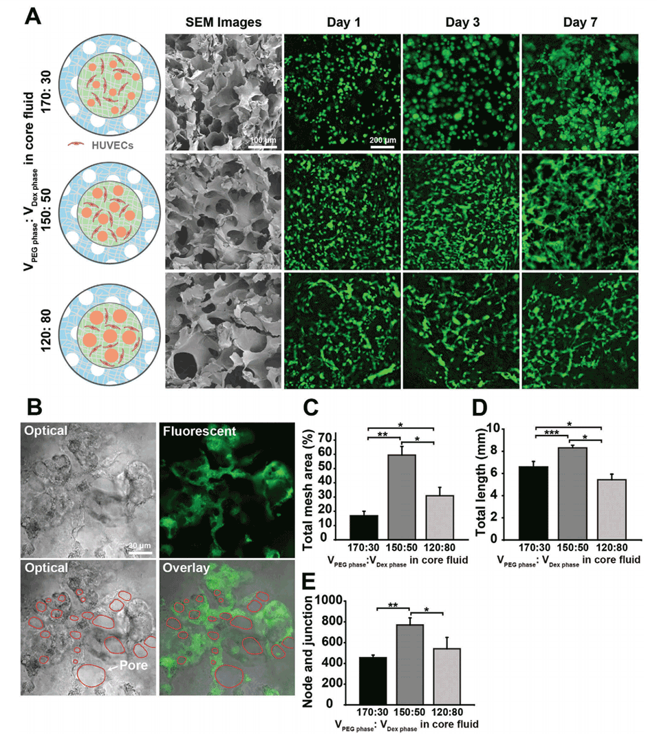 通过调整核心流体和壳层流体中PEG相与Dex相的体积比,可以实现对微球核心和壳层尺寸及孔径的精确调节,例如核心孔径从25至70 μm,壳层孔径从20至50 μm。