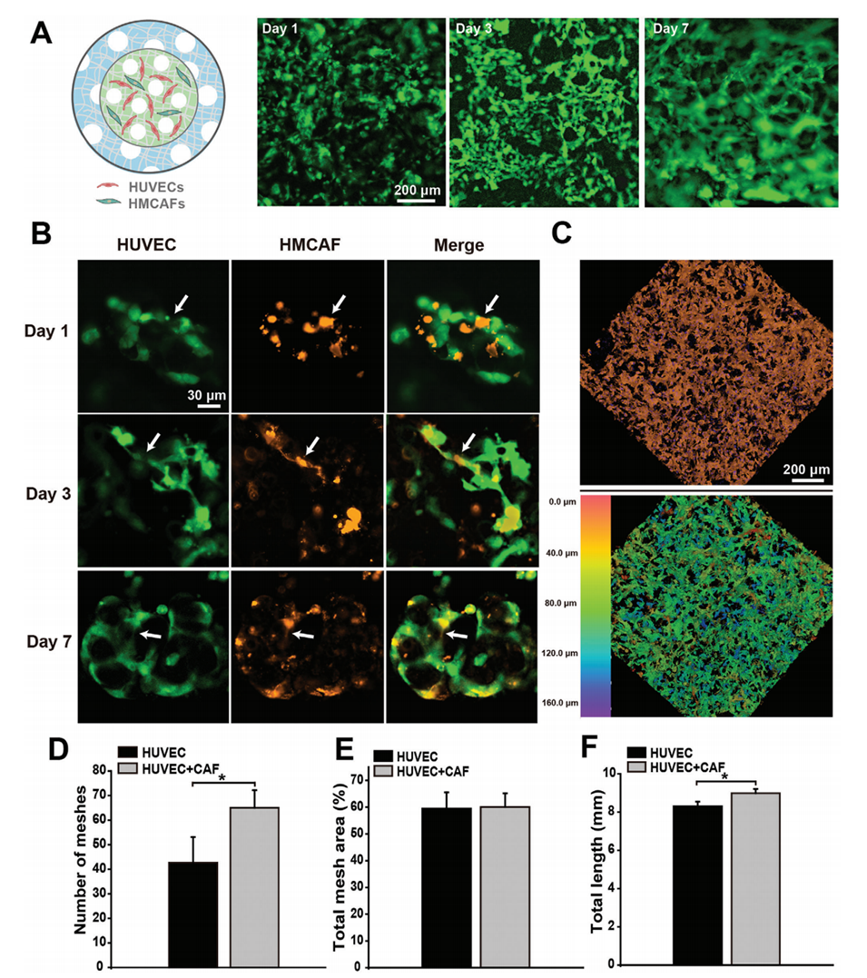 图3:CAFs在血管生成中的作用。A:示意图展示了HUVECs和CAFs在P-CS-AM微球中的分布以及在共培养3天、7天后的血管化情况。B:在1、3、7天时,CAFs在新血管形成中的定位情况。C:共培养7天后,HUVECs和CAFs在P-CS-AM微球核中的血管网络形成和深度分布的共聚焦图像。D-F:在培养7天时,HUVECs和CAFs共培养系统在微球核中的网格数量、总网格面积和总血管管长度。结果显示,CAFs显著促进了血管密度的增加。