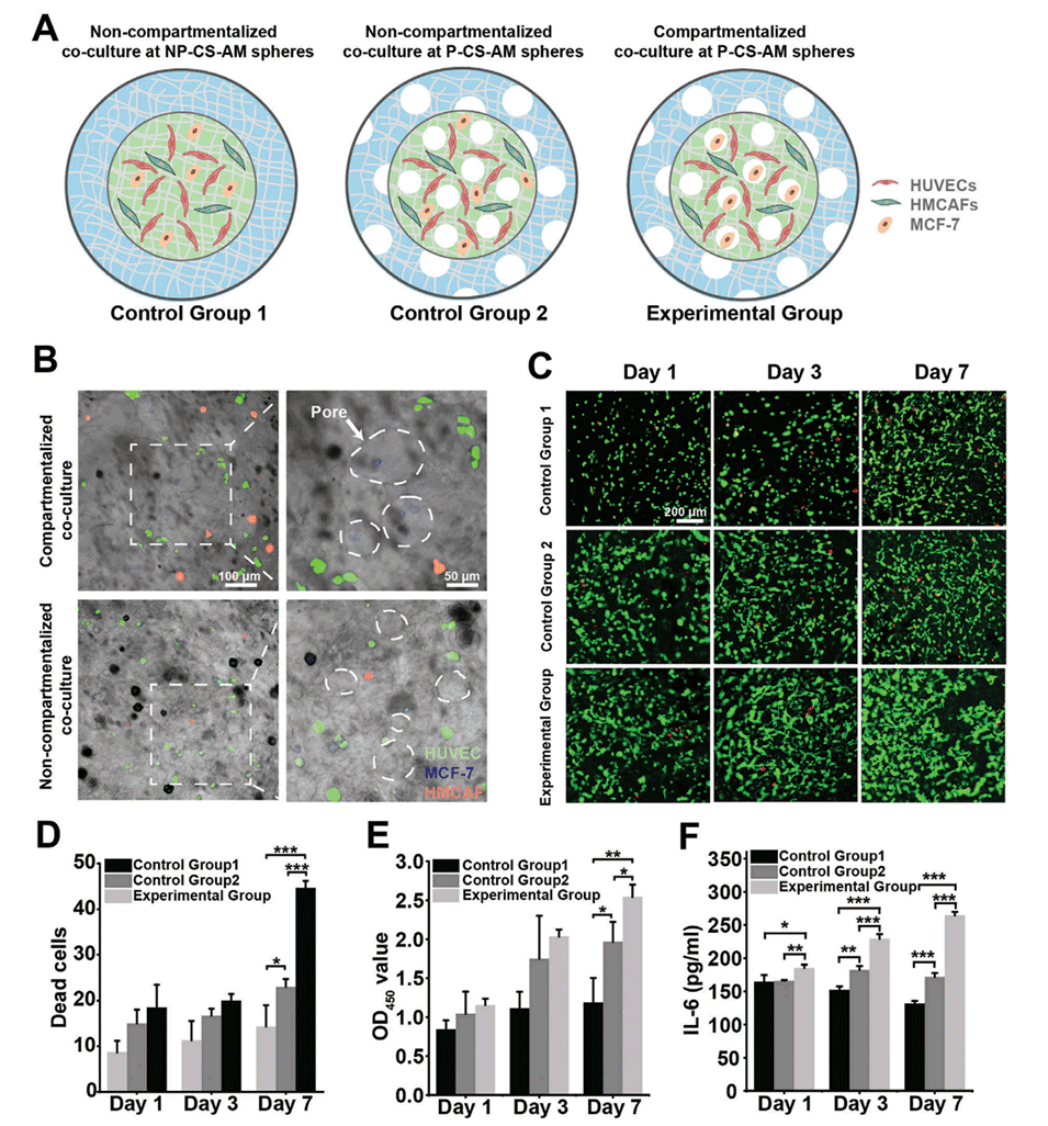 图4:单PVM模型的构建。A:示意图展示了在对照组和实验组中,HUVECs、CAFs和MCF-7细胞的分布情况。B:共聚焦图像展示了在对照组2和实验组中,HUVECs、CAFs和MCF-7细胞的分布情况。C:在1、3、7天时,对照组和实验组的活/死荧光结果。D-F:在1、3、7天时,对照组和实验组的死亡细胞数量、OD450值和IL-6分泌水平。结果显示,实验组的细胞增殖率更高,细胞死亡数量更少,且IL-6分泌水平更高。