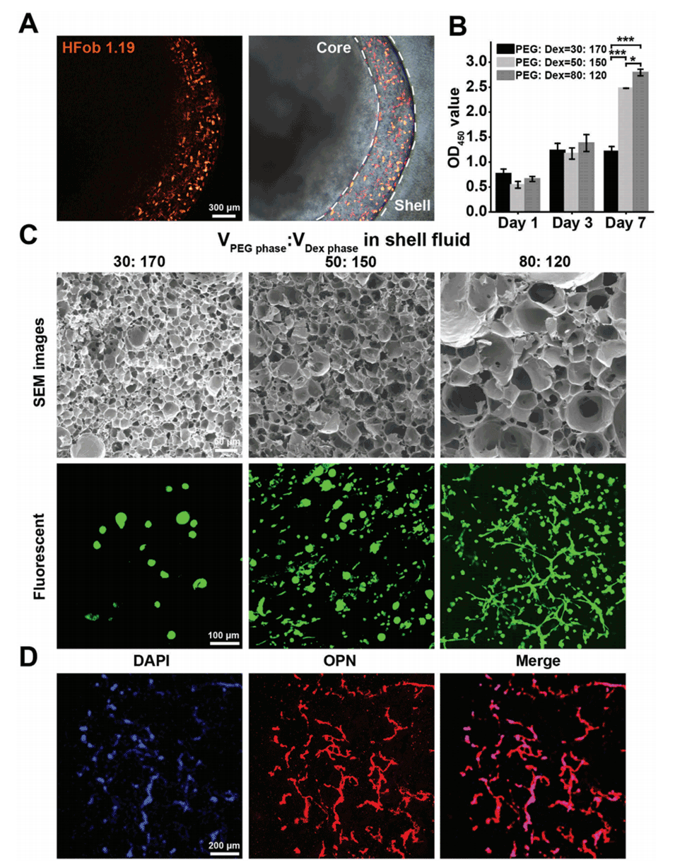 图5:单EM模型的构建。A:hFob 1.19细胞在P-CS-AM微球中的分布情况。B:在不同培养时间(1、3、7天)下,不同孔径大小的微球壳中hFob 1.19细胞的OD450值。C:不同孔径大小的微球壳中hFob 1.19细胞的SEM图像,展示了细胞在培养7天后的生长情况。D:在培养7天时,hFob 1.19细胞在微球壳中表达的骨桥蛋白(OPN)水平。结果显示,孔径为50 μm的微球壳为成骨细胞提供了最佳的生长环境。