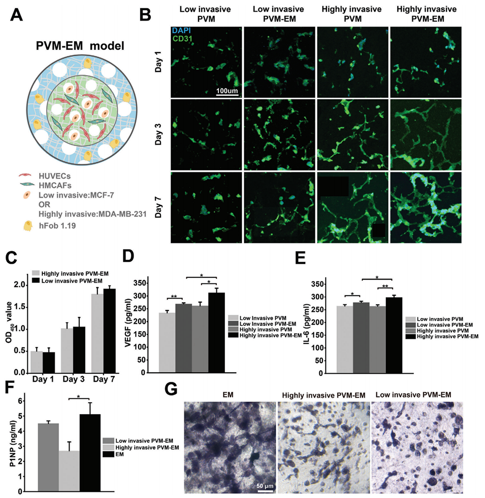 图6:多微环境模型的构建。A:示意图展示了在PVM-EM模型中不同细胞类型的分布情况。B:在不同培养时间下,不同模型中CD31的表达水平。C:两种PVM-EM模型在1、3、7天时的OD450值。D-F:在培养7天时,不同模型中VEGF、IL-6和P1NP的分泌水平。G:在培养7天时,不同模型中ALP的染色结果。结果显示,PVM-EM模型能够有效模拟乳腺癌骨转移早期的关键过程,包括细胞因子分泌增加、血管生成和成骨活性抑制。