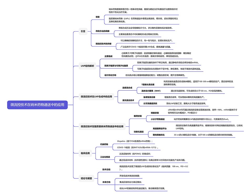 微流控系统通过精准的流体控制、多级结构设计和动态环境模拟,显著提升了LNPs在靶向递送、联合治疗、智能控释等功能化方向的应用潜力。其高通量筛选和并行化生产特性,进一步加速了功能化LNP的临床转化。