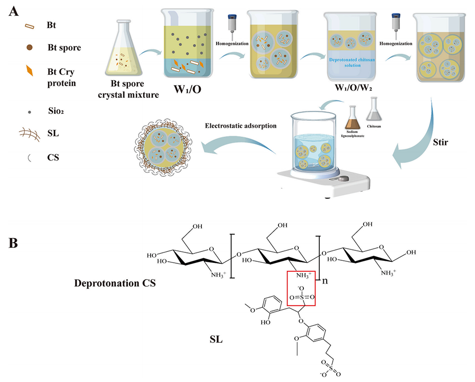 图1.Bt微胶囊制备流程图(A)。壳聚糖和木质素磺酸钠通过静电相互作用增强脱质子化壳聚糖基Pickering乳液的示意图(B)。