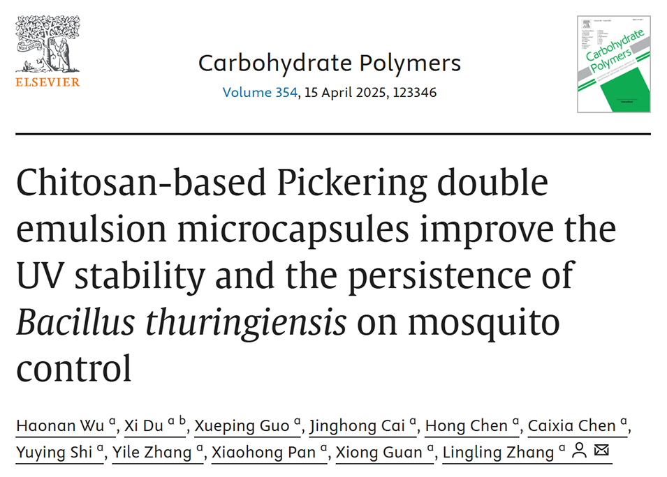 苏云金芽孢杆菌(Bt)在害虫防治应用中受到紫外线辐射和细菌沉降的影响,导致农药利用率低,防治时间短。为了提高Bt在这些应用中的稳定性并延长生物防治的持续时间,近期,福建农林大学张灵玲教授团队开发了一种壳聚糖基Pickering双乳液微胶囊,用于包埋Bt,以提高其在紫外线下的稳定性、悬浮性能和持效性。相关研究以“Chitosan-based Pickering double emulsion microcapsules improve the UV stability and the persistence of Bacillus thuringiensis on mosquito control”为题目,发表在期刊《Carbohydrate Polymers》上。