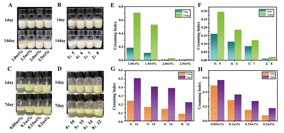 图2.乳液稳定性评估。(A)(E)纳米二氧化硅制备的W1/O乳液在第1天和第14天的形态特征和分层指数。(B)(F)不同油水比制备的W1/O乳液在第1天和第14天的形态特征和分层指数。(C)(G)用不同质量分数的纳米壳聚糖制备的W1/O/W2乳液在第1天和第14天的形态特征和分层指数。(D)(H)不同油水比制备的W1/O/W2乳液在第1天和第14天的形态特征和分层指数。