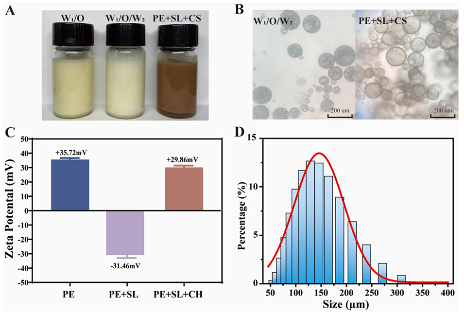 图3.乳液制备各阶段的形态(A)。光学显微镜观察(B)。ζ电位(C)。微胶囊粒径分布(D)。
